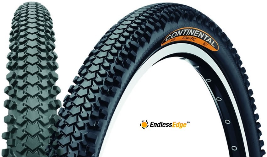 Traffic 26x2.1 - Opona Continental Znakomita opona do codziennego użytku w mieście i za miastem. Podwyższony środkowy grzbiet dla płynnego i komfortowego toczenia się na ubitych drogach i chodnikach. Bieżnik Endless Edge posiada pięciokątne wypusty rozmieszczone w sposób, który gwarantuje dokładne sterowanie, bezpieczne prowadzenie i czułe hamowanie w każdych warunkach.