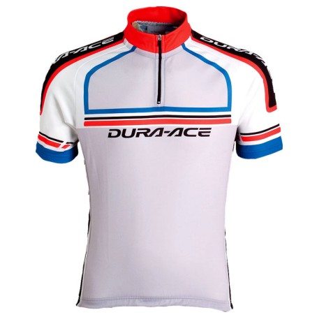 Performance Dura-Ace Koszulka Shimano Wykonana jest z zapewniającej swobodę ruchów oraz jak największą wygodę tkaniny poliestrowej (100%), która w połączeniu z otwartą strukturą siateczkową daje maksymalną wentylację podczas jazdy na rowerze w upalne dni. Ma tradycyjny, dopasowany krój oraz takie dodatki jak centralne przednie zapięcie na zamek błyskawiczny do połowy długości oraz specjalną potrójną kieszeń tylną.