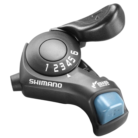 DĽwignie przerzutki sterowane kciukiem. Prawa 6-rzędowa indeksowana, lewa 3-rzędowa płynna.