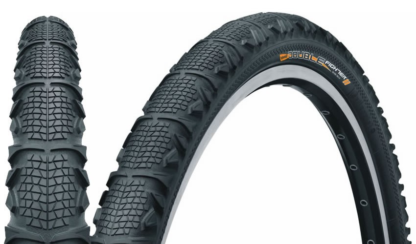 Double Fighter II 28 Opona Continental Nowy Double Fighter korzysta z udanej koncepcji swojego poprzednika. Środek ze swoim delikatnym bieżnikiem obraca się płynnie i cicho na asfalcie. W terenie mocny boczny bieżnik zapewnia niezbędną przyczepność. Duble Fighter II skutecznie łączy dużą prędkość na szosie z niezawodną przyczepnością w terenie i dlatego jest odpowiedni dla rowerów MTB, które są używane głownie do jazdy po utwardzanych drogach lub w terenie w suchych letnich warunkach.
