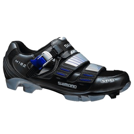 Buty SH-M182 Podeszwa wzmocniona włóknem szklanym z podwójnie wtryskiwaną elastyczną nylonowo-poliuretanową zewnętrzną podeszwą przenosi energię bezpośrednio do pedałów. Cholewka z oddychającej siateczki i syntetycznej skóry pokrytej poliuretanem dla komfortowego dopasowania podczas długich tras. Precyzyjnie regulowana sprzączka i dwa przesunięte paski dobrze mocują stopę i pozwalają na dokonywanie dokładnych ustawień. Przesunięte przylepce pozwalają na uniknięcie ucisku. Przedłużone, skracane przylepce umożliwiają wygodne ustawienie zgodnie z osobistymi preferencjami.