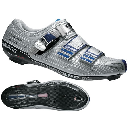 Buty SPD-SL SH-R300 Carbon Shimano Innowacyjna technologia Shimano dopasowywania formowaniem buta na gorąco. Profesjonalna stabilność, lekkość i wygoda. Profilowana, anatomiczna pięta dla naturalnego styku buta ze stopą. Zaawansowane, odporne na rozciąganie materiały choewek. Podeszwa z włókna karbonowego Nanotec zapewnia większą wytrzymałość i lepsze przekazywanie mocy oraz mniejszą masę. Zintegrowana karbonowa podeszwa z piętą zapewnia jednolitą konstrukcję mniej podatną na zużycie. Antypoślizgowe pokrycie pięty pięty z wszytymi włóknami metalowymi zapobiega unoszenie się piety oraz znacznie opóznia zużycie podeszwy. Astymetryczne ułożenie sprzączki z mikroregulacją i rzepów eliminuje ucisk na stopę oraz zapewnia możliwość idealnego dopasowania do stopy.